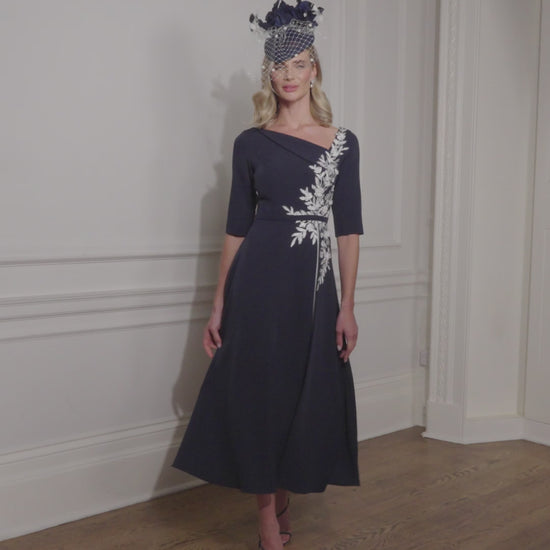 Step into timeless sophistication with this beautifully tailored A-line dress by John Charles. Featuring graceful ¾ sleeves and an asymmetrical neckline, the design effortlessly blends modern flair with classic elegance. Delicate floral appliqués adorn the bodice, adding a touch of romantic texture, while a coordinating trim cinches the waist for a flattering silhouette. The front showcases a refined pleated section, enhancing the flow and structure of the skirt. Perfect for weddings, formal occasions, or any event where elegance is a must.