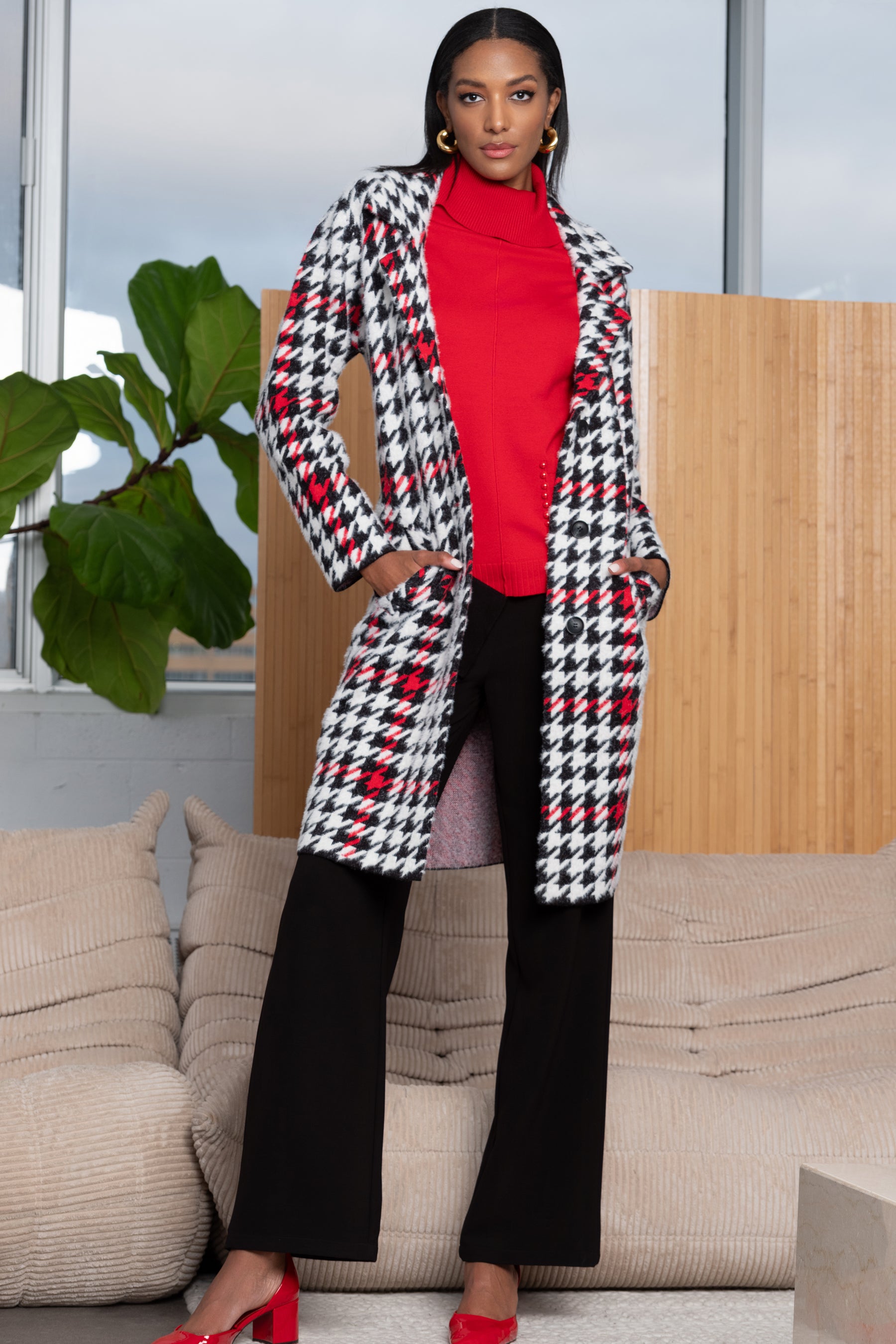 Make a bold statement with the Alison Sheri Houndstooth Cardigan in black, red, and white. This soft knit cardigan features a classic collared neckline, eye-catching houndstooth pattern, and sleek black button closure. Combining timeless style with cozy comfort, it's the perfect layering piece for polished, everyday looks or dressed-up occasions.