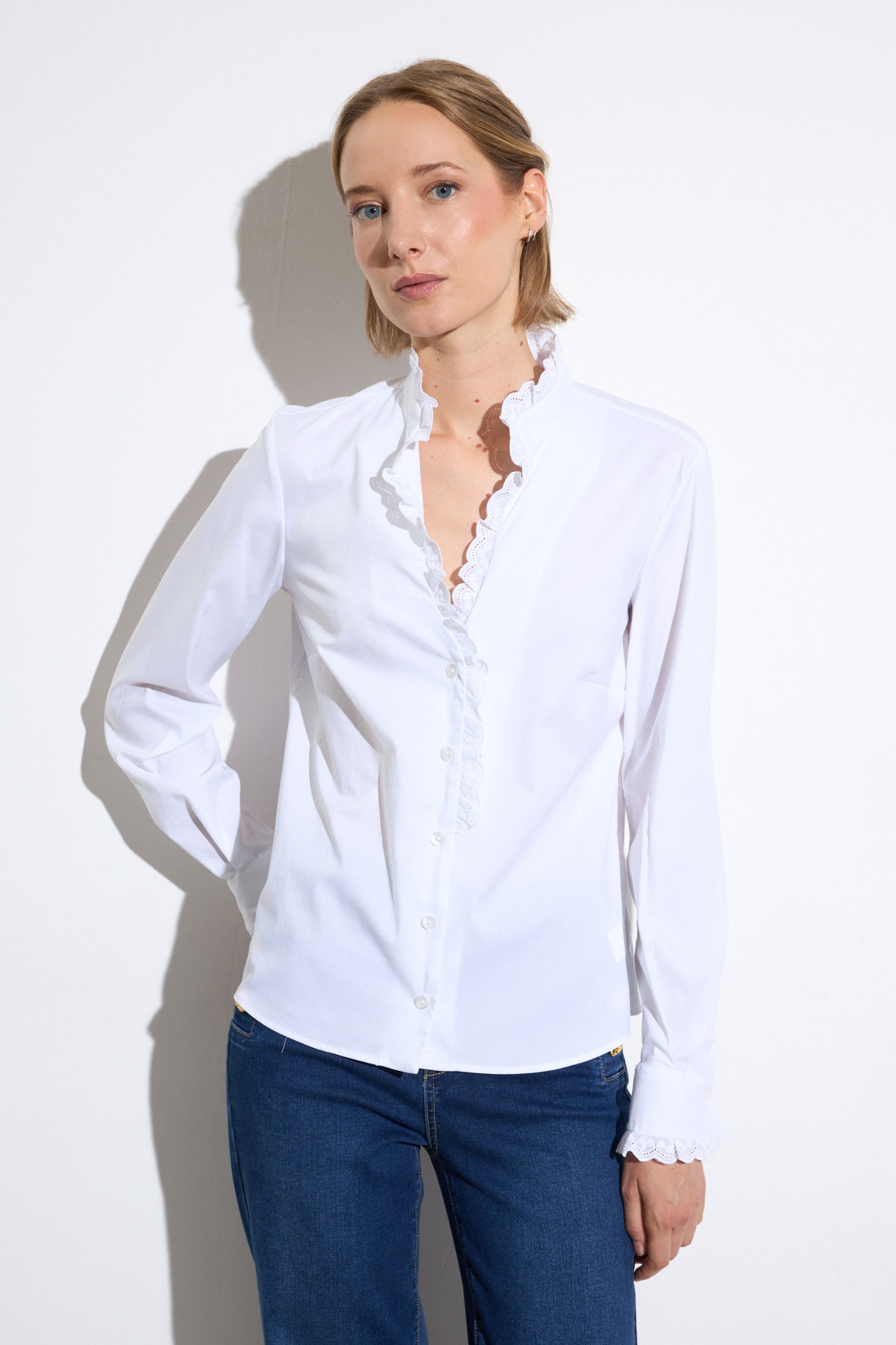 The Bariloche Shirt is designed with a romantic frill collar and matching frilled button placket, complete with a classic button closure. Long sleeves are finished with delicate frill cuffs, creating an elegant, feminine silhouette that adds refined charm to any outfit.