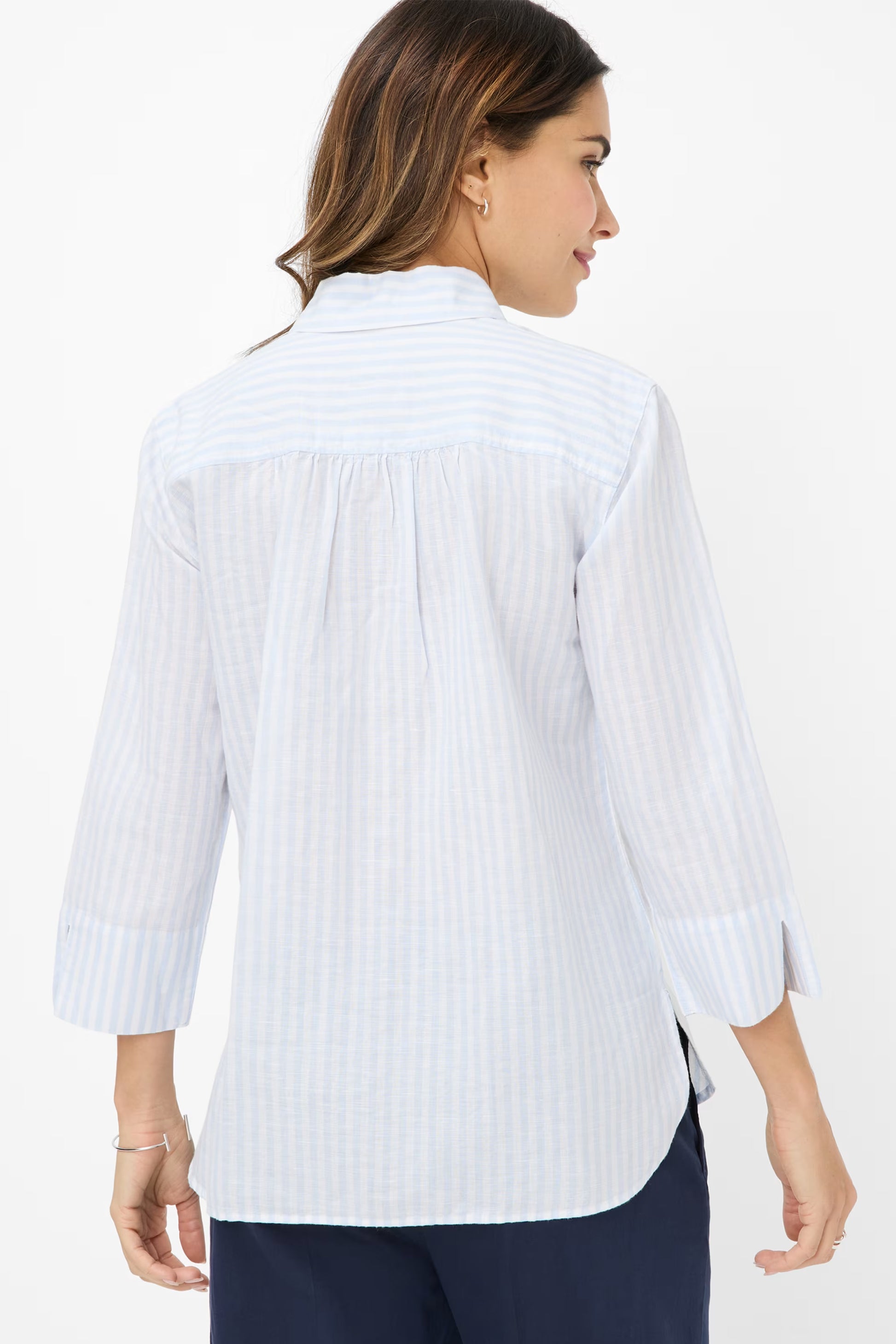 A fresh spring look with fashionable sophistication: The shirt blouse in the Vicky style combines casual elegance with a timeless design. Its flared shape flatters the silhouette and the concealed button placket creates a clean look. The 3/4-length sleeves give the look a modern touch, while subtle stripes and hem slits round off the blouse with a dynamic lightness. The feminine gathers at the back are particularly charming and add a gentle movement to the design. Thanks to the high-quality material blend of 55% linen and 45% cotton, the blouse feels light and airy and ensures maximum comfort - perfect for stylish springtime moments.
