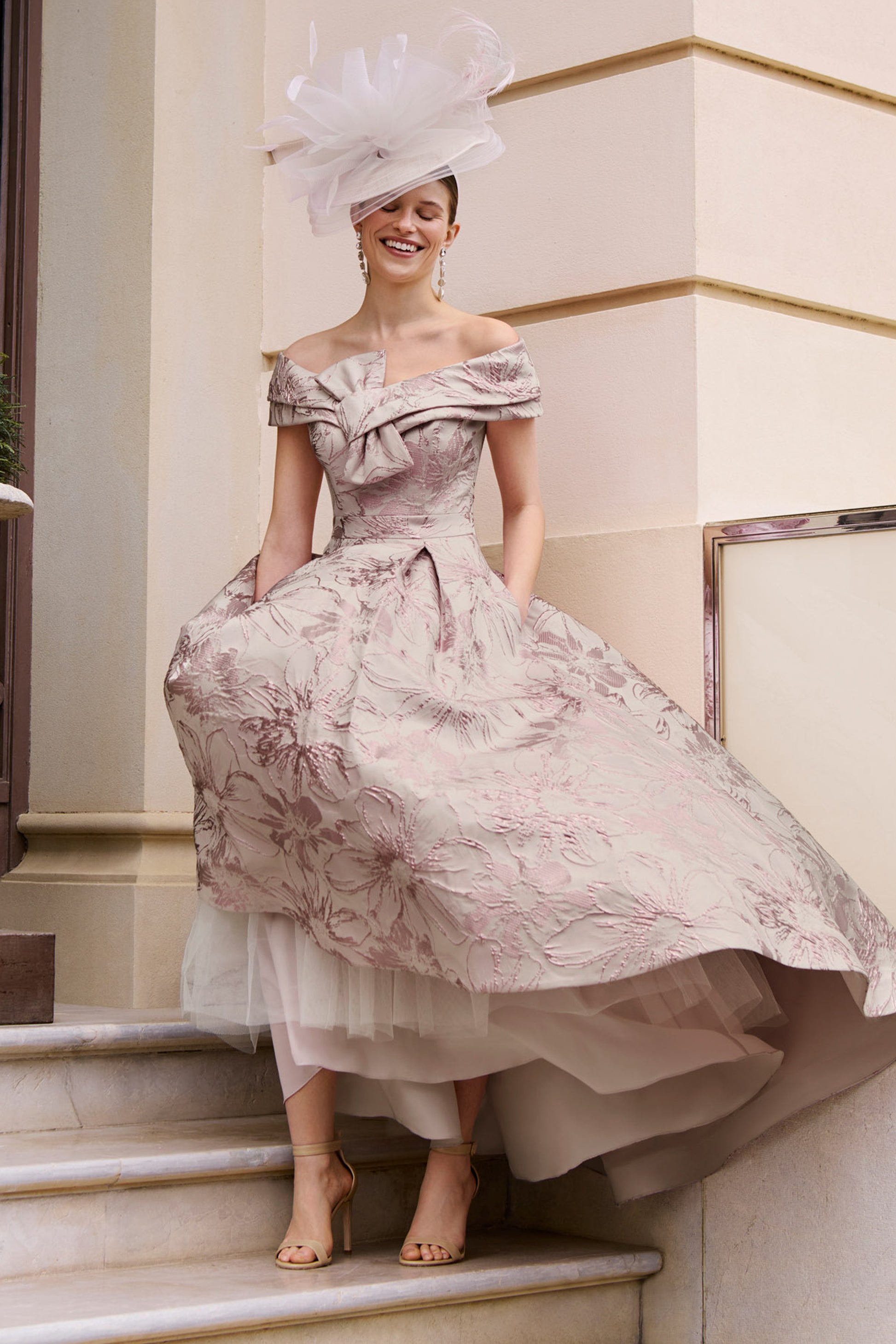 Embrace timeless elegance with the Couture Club Printed Brocade Dress in chalk rose. Crafted from luxurious brocade fabric, this exquisite dress features a flattering off-the-shoulder neckline with bow detail for added sophistication. A stunning choice for the Mother of the Bride or Groom or any elegant special occasion.