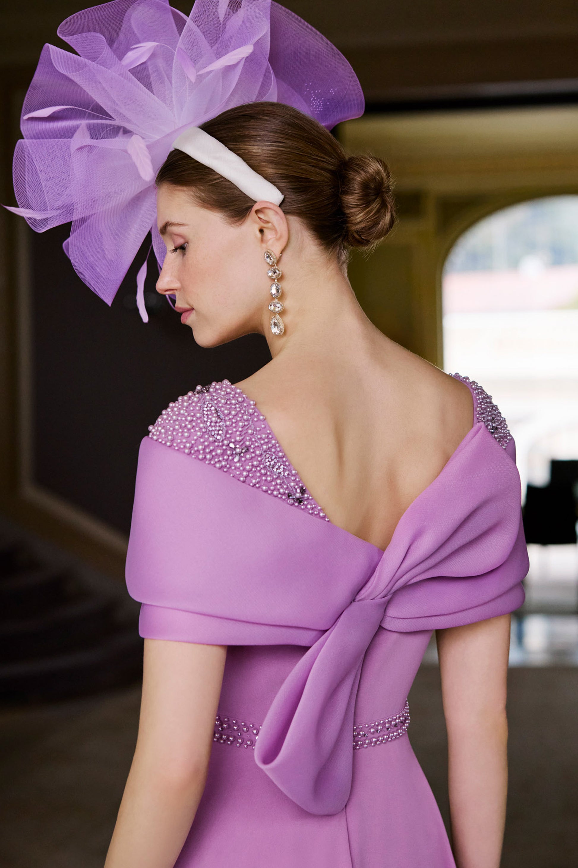 A refined midi dress crafted in fluid georgette with delicate hand-beaded embellishment. Designed with a flattering wrap neckline and softly draped sleeves, it features an elegant bow-accented back and matching shawl for added sophistication. Perfectly tailored for the modern Mother of the Bride or Groom, or any discerning wedding guest seeking timeless glamour with a contemporary twist.