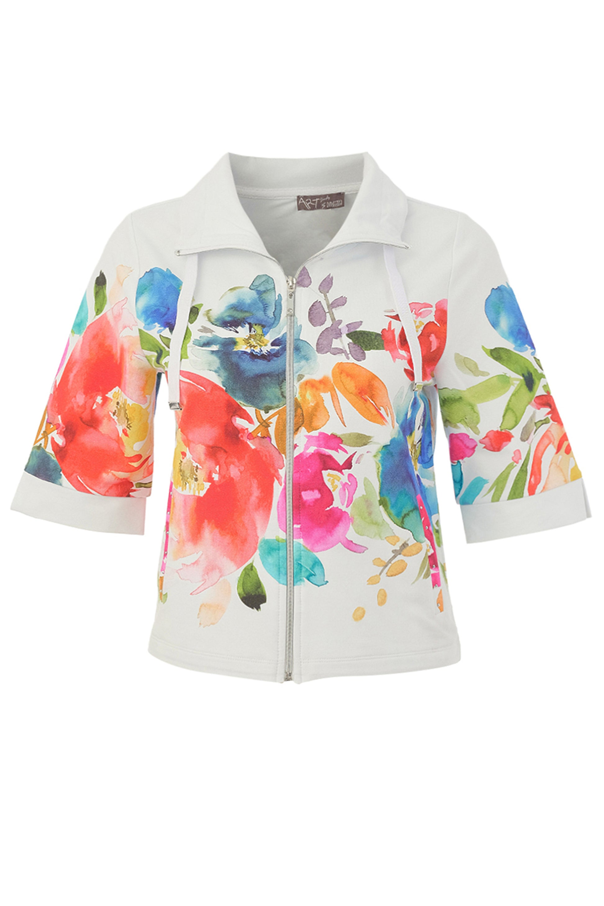 Bring vibrant style to your wardrobe with the Dolcezza "Spring Delight by Majella LeBlanc" Jacket in White. This eye-catching jacket features a bright, multicolored floral print over a crisp white background, a collared neckline with stylish tabs, and flattering three-quarter length bell sleeves. Finished with a convenient zip closure, it’s the perfect statement piece for spring and summer layering.