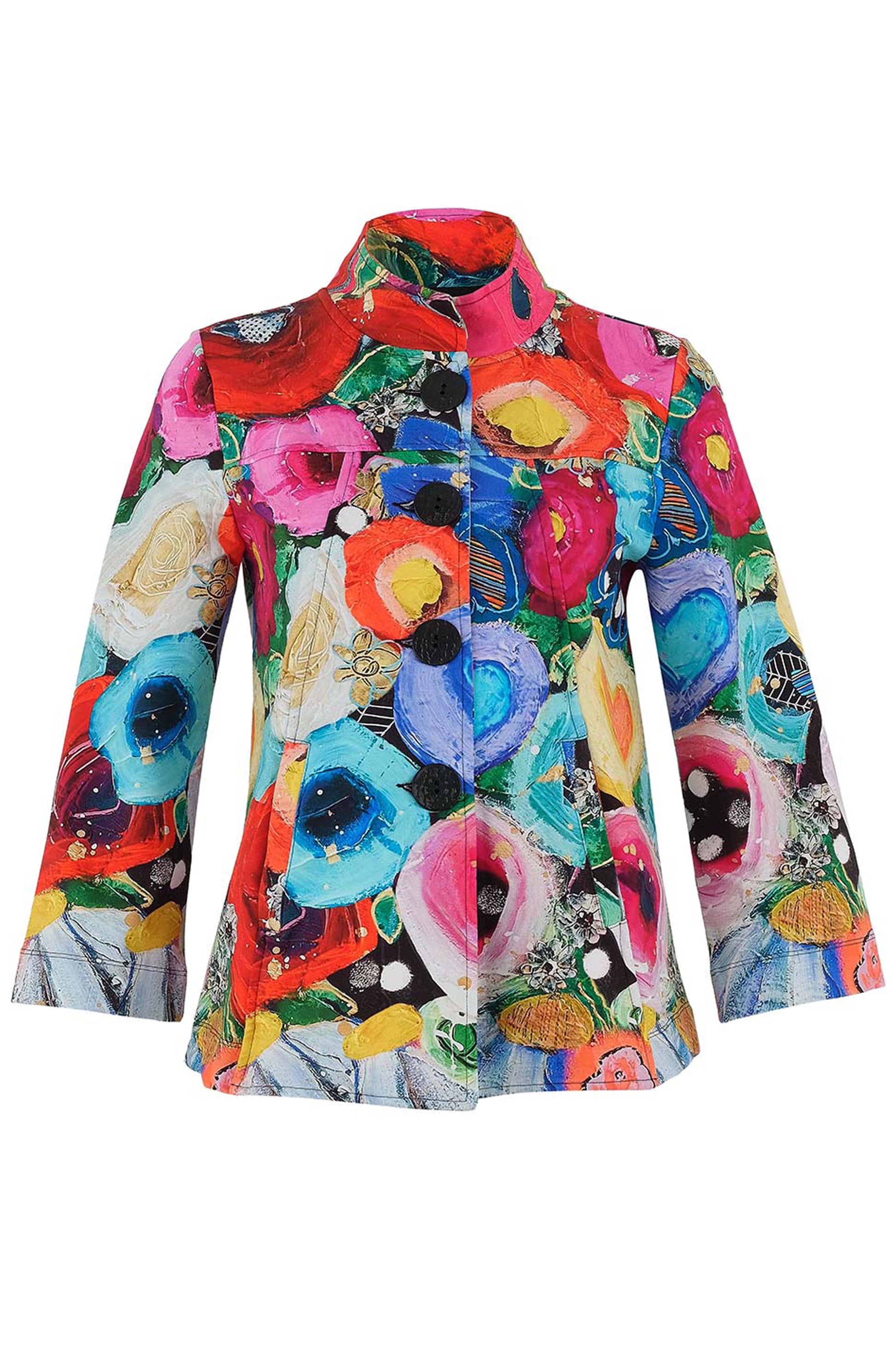 Brighten your wardrobe with the Dolcezza "I Believe In Angels" Print Jacket, featuring an exclusive artwork by Quebec artist Vigo. Designed in a vibrant array of colours, this statement jacket includes a high neckline, elegant black button closure, concealed front pockets, and a flattering back dart for a tailored fit. A true blend of art and style.