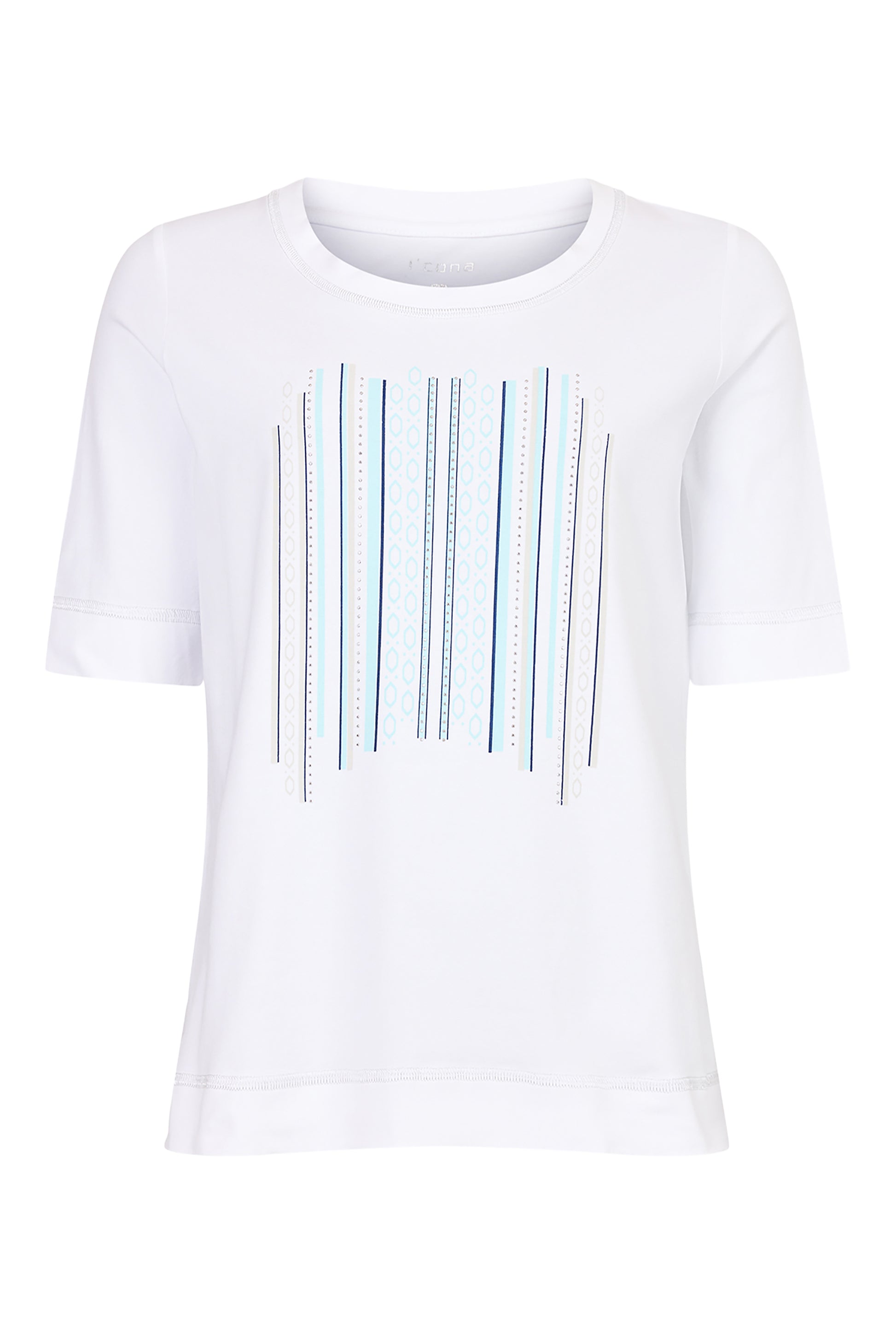 Elevate your casual wardrobe with the I'cona Embellished Detail T-Shirt in White. Featuring a chic geometric print in aqua, blue, and beige, this stylish tee is enhanced with delicate embellishments for a touch of sparkle. Designed with a classic round neckline and short sleeves, it offers effortless elegance and all-day comfort. Perfect for pairing with jeans or tailored trousers, this versatile piece adds a refined statement to any outfit. Shop now for a fresh take on everyday fashion!