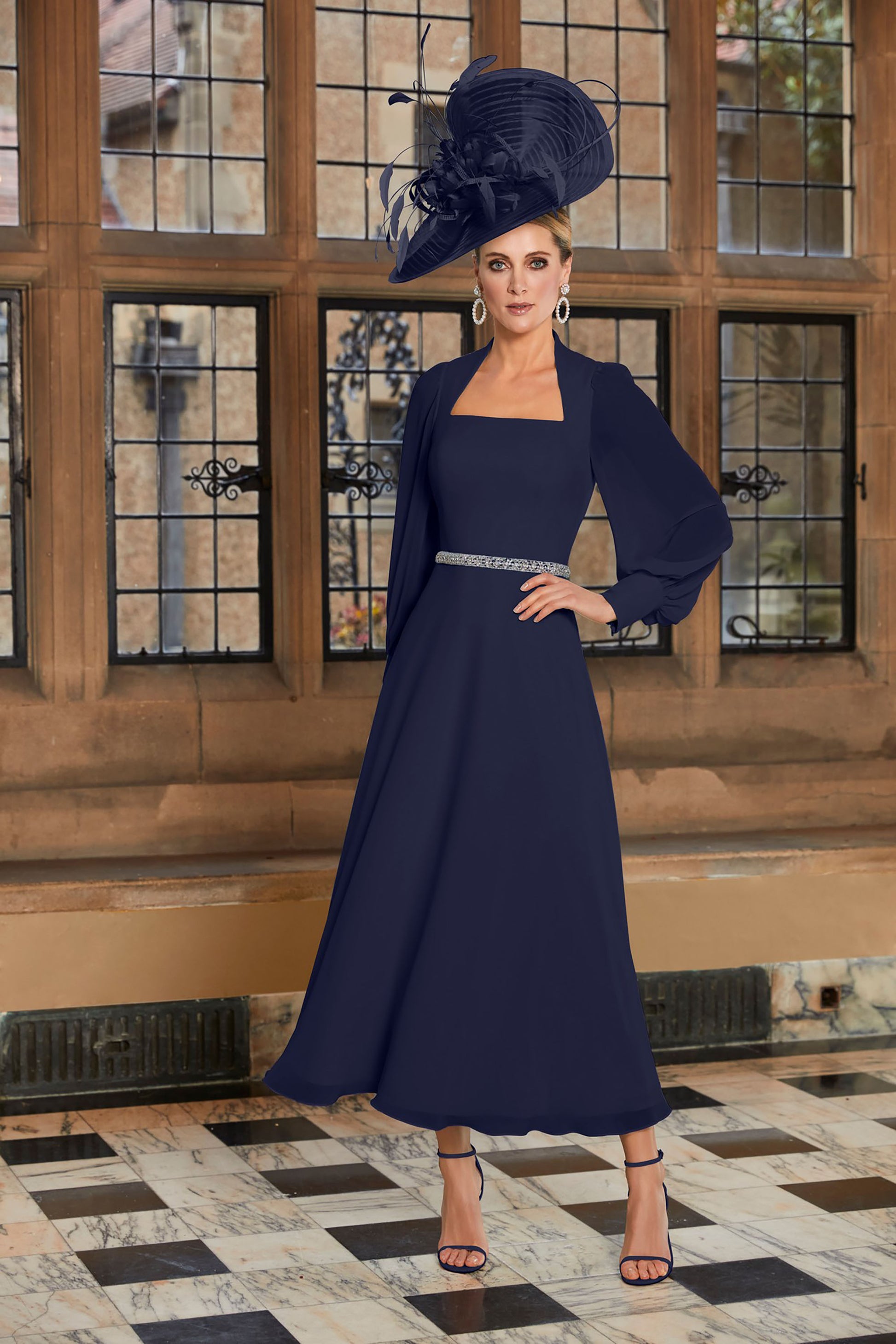 A simplistic elegant A-line dress the puffed sleeves and square neckline. Detailed with a beaded elegant belt. Perfect for the most sophisticated of mothers.