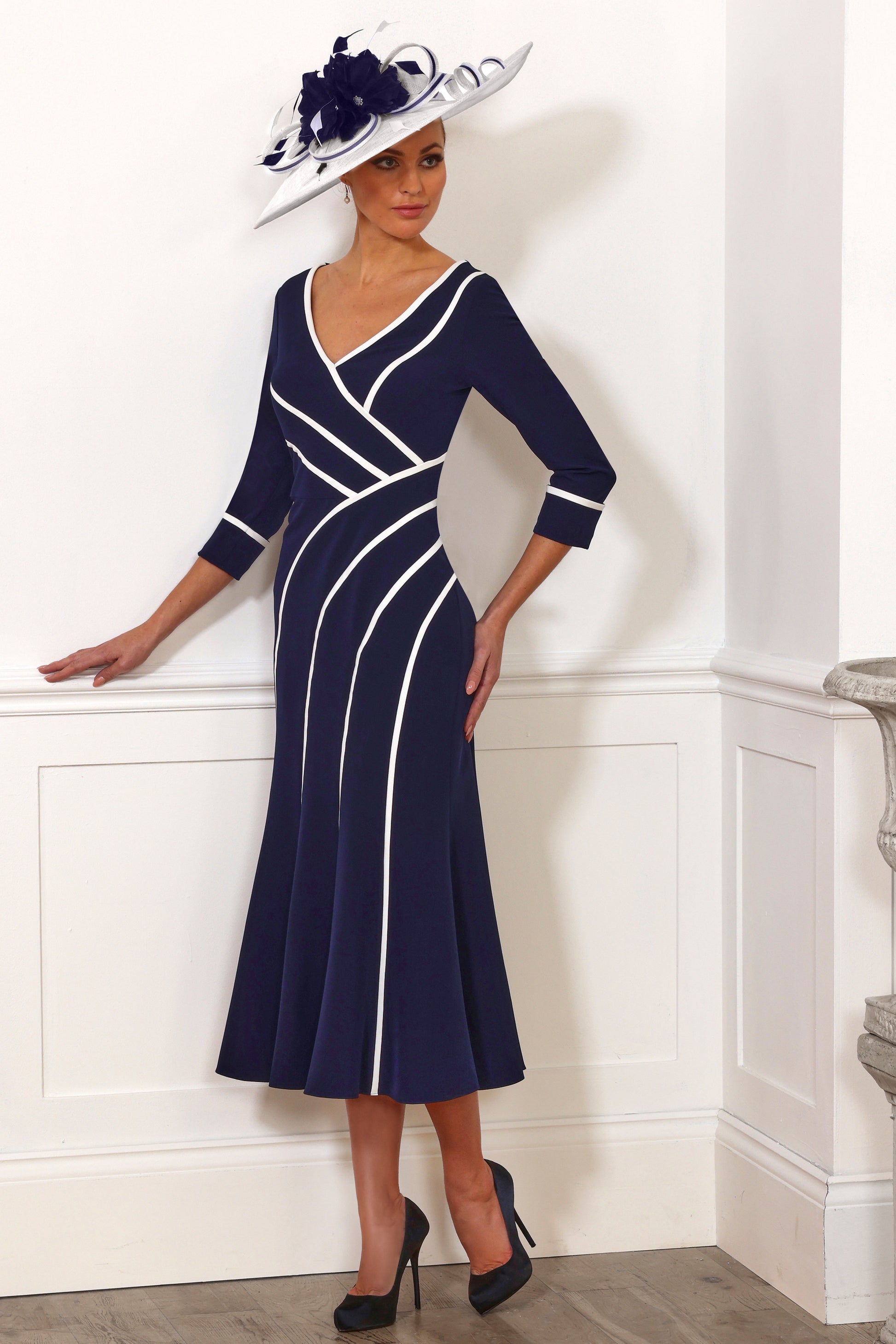 Turn heads with the Irresistible Piped Detail Fit 'n' Flare Dress . This elegant piece features a flattering V neckline and three-quarter length sleeves, making it perfect for any occasion. The stylish piped detail adds a touch of modern sophistication to this must-have dress.