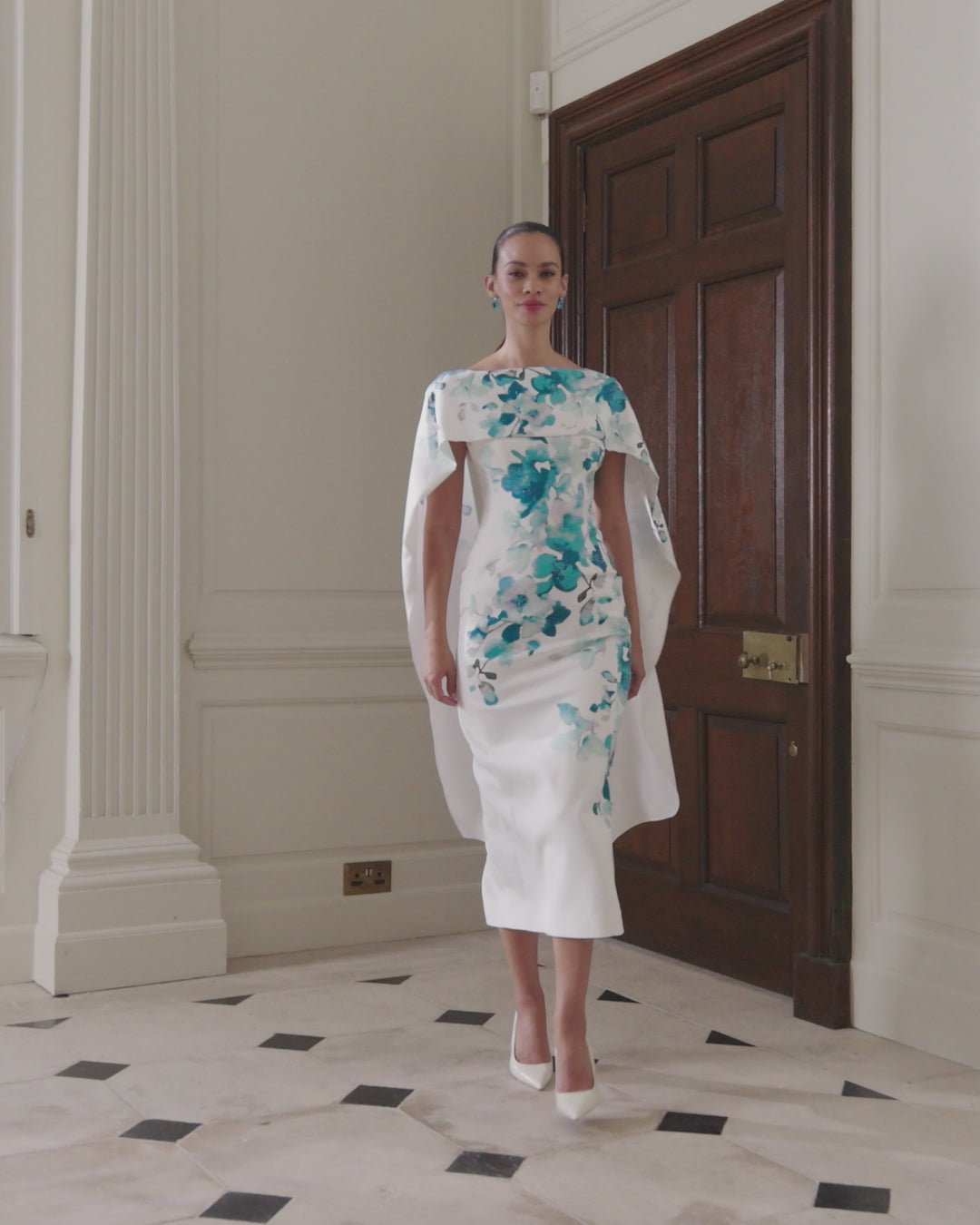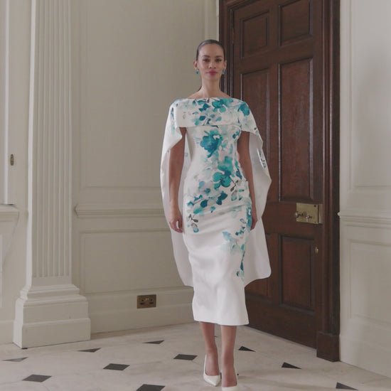 This sophisticated John Charles dress features a floral print throughout, with a sleek straight silhouette enhanced by a cape that drapes elegantly over the shoulders and down the sides. The cape can be tied at the back for a customizable, graceful finish. "Designed for weddings and special occasions, these dresses exude elegance and charm, helping you look radiant and feel confident wherever you go."