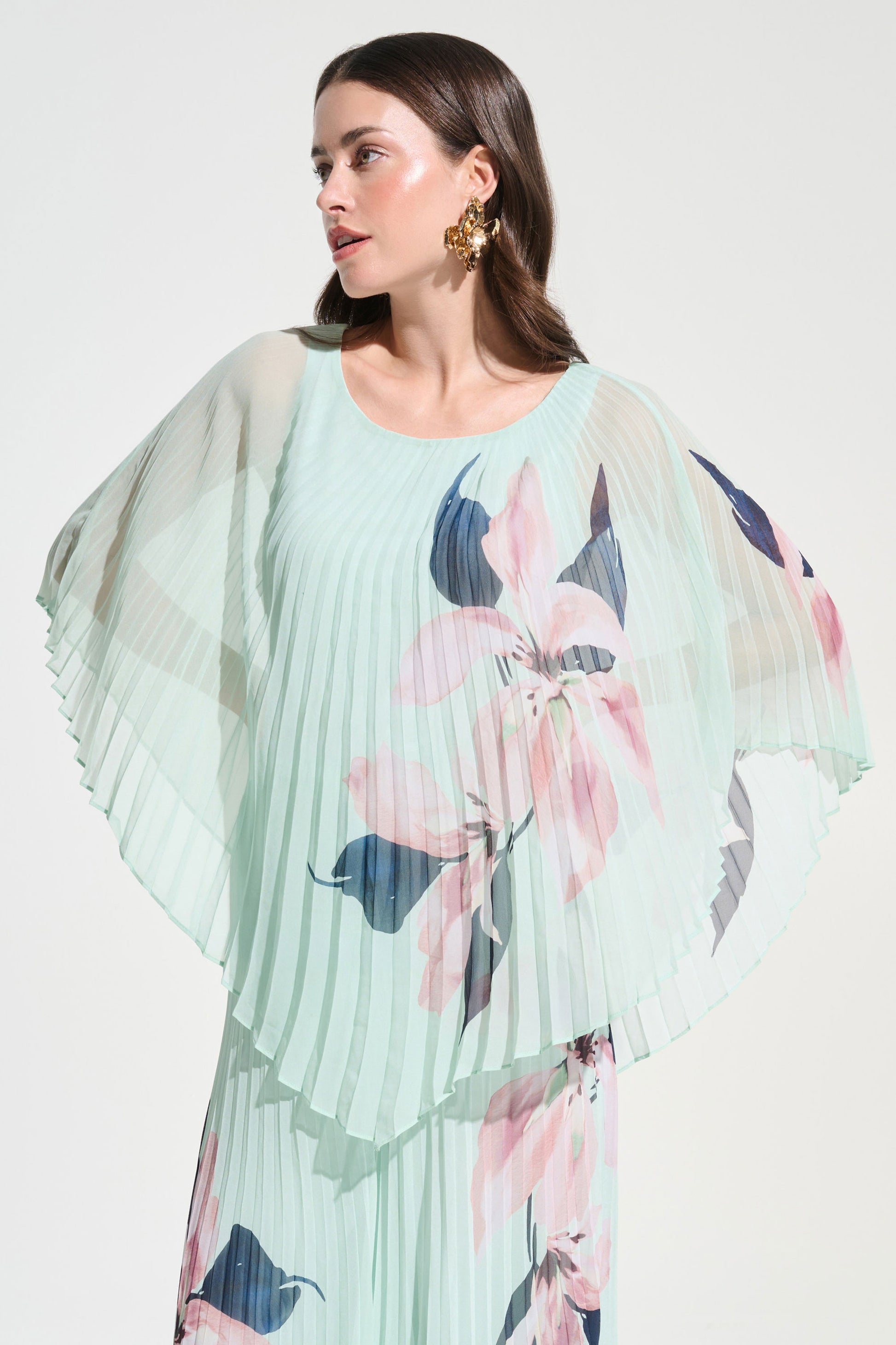 This elegant two-piece set pairs light, airy chiffon with a beautifully placed floral print for a refined, feminine look. The layered poncho top features floral placement pleating flowing over a silky knit base, designed with a boat neckline, three-quarter sleeves, and a centred V-hem that creates graceful, fluid lines. Coordinating pleated wide-leg pants complete the look with a separate waistband for subtle structure and a fully lined, flowing silhouette. Together, the set offers effortless elegance and polished movement, perfect for special occasions and elevated events.