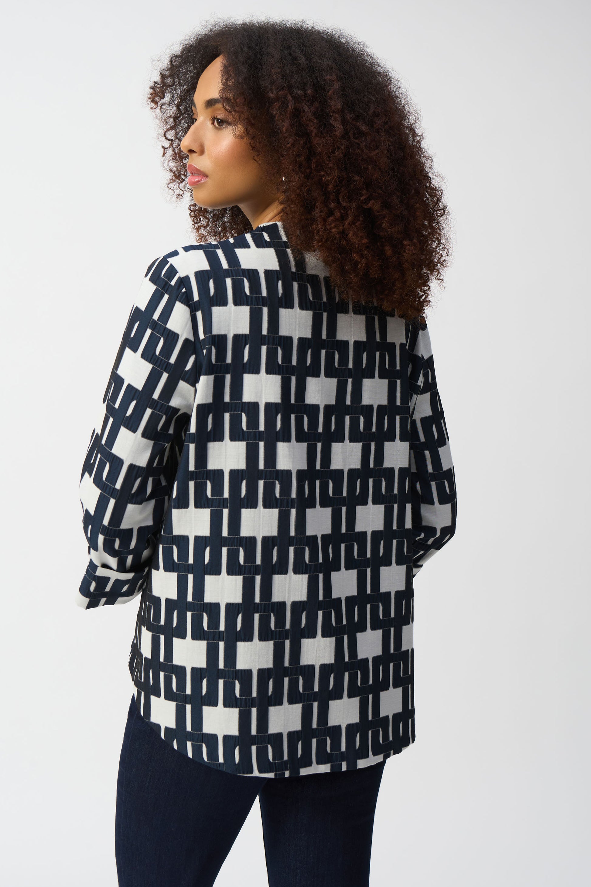 This chic jacquard jacket captures the essence of refined style. The fabric boasts a stunning geometric print that exudes timeless elegance. The sleek crew neck and three-quarter cuffed sleeves complement the garment’s bold trapeze silhouette and elevate the piece’s polished look. A delicate statement button adorns the jacket, adding a touch of more flair to this contemporary design.