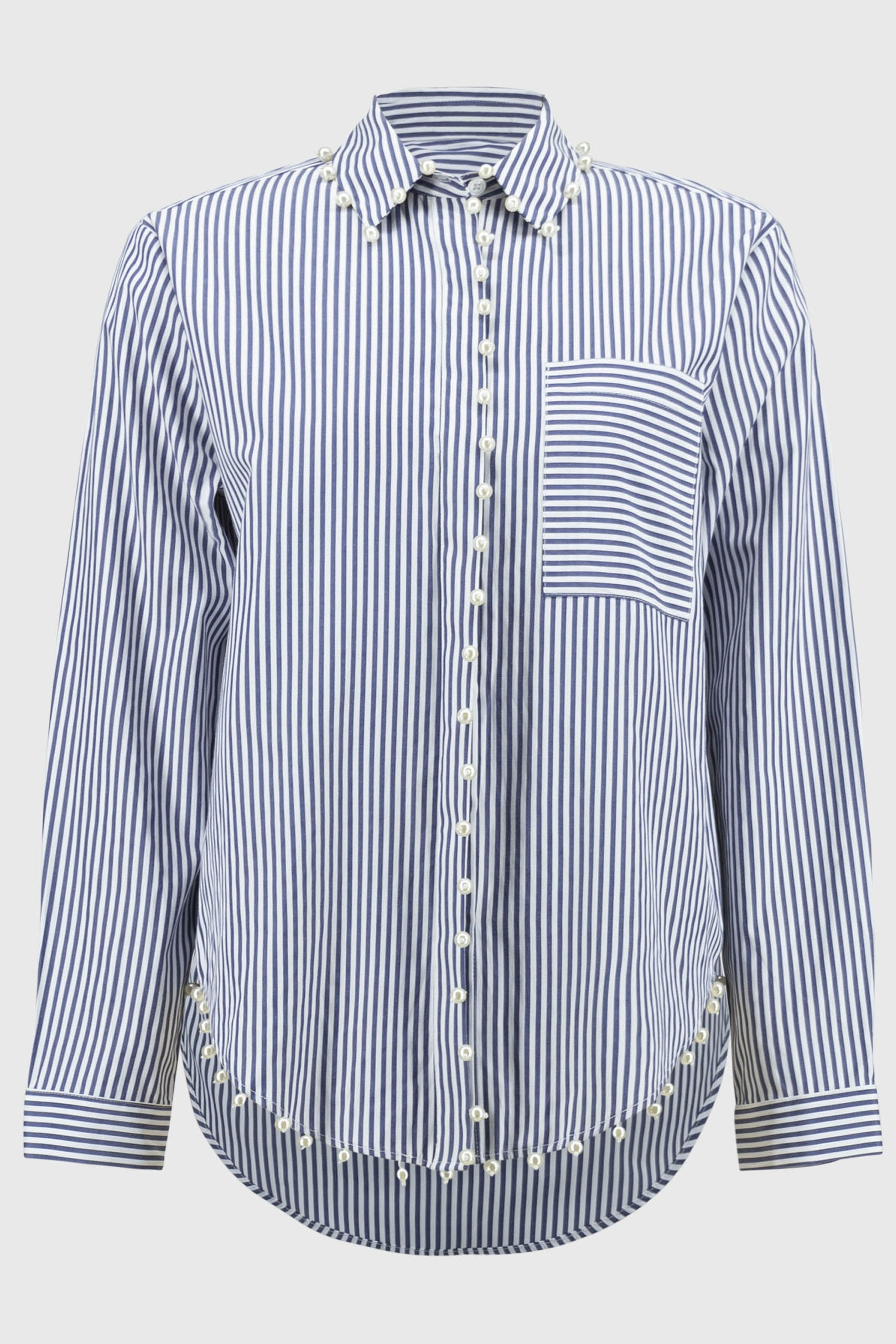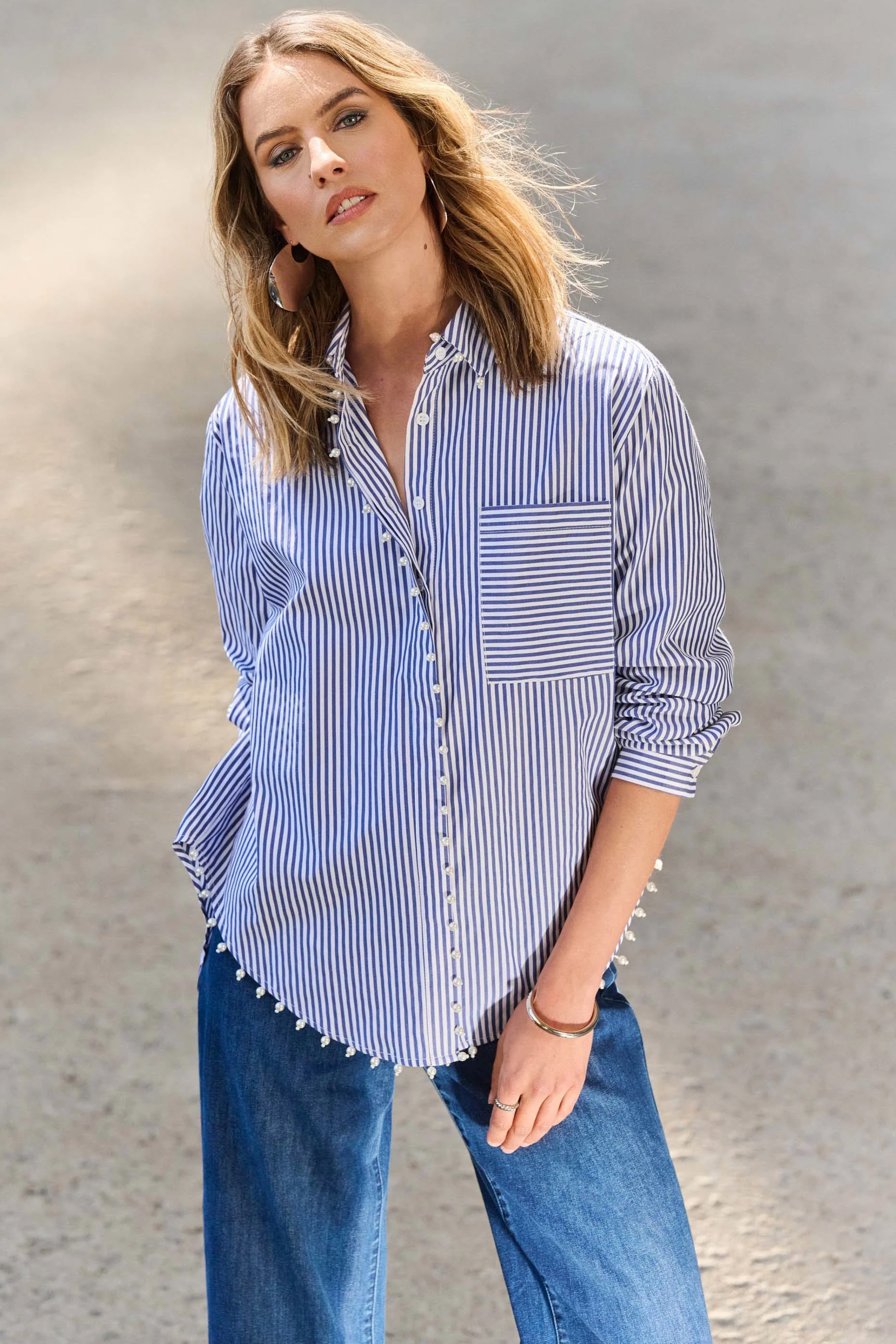 No closet would be complete without a classic striped button-down shirt. This versatile piece offers a touchable soft stretch cotton fabric, a flattering high-low hem, and feminine pearl trim. Wear it casually with your favourite jeans, or dress it up with white pants and statement jewellery.