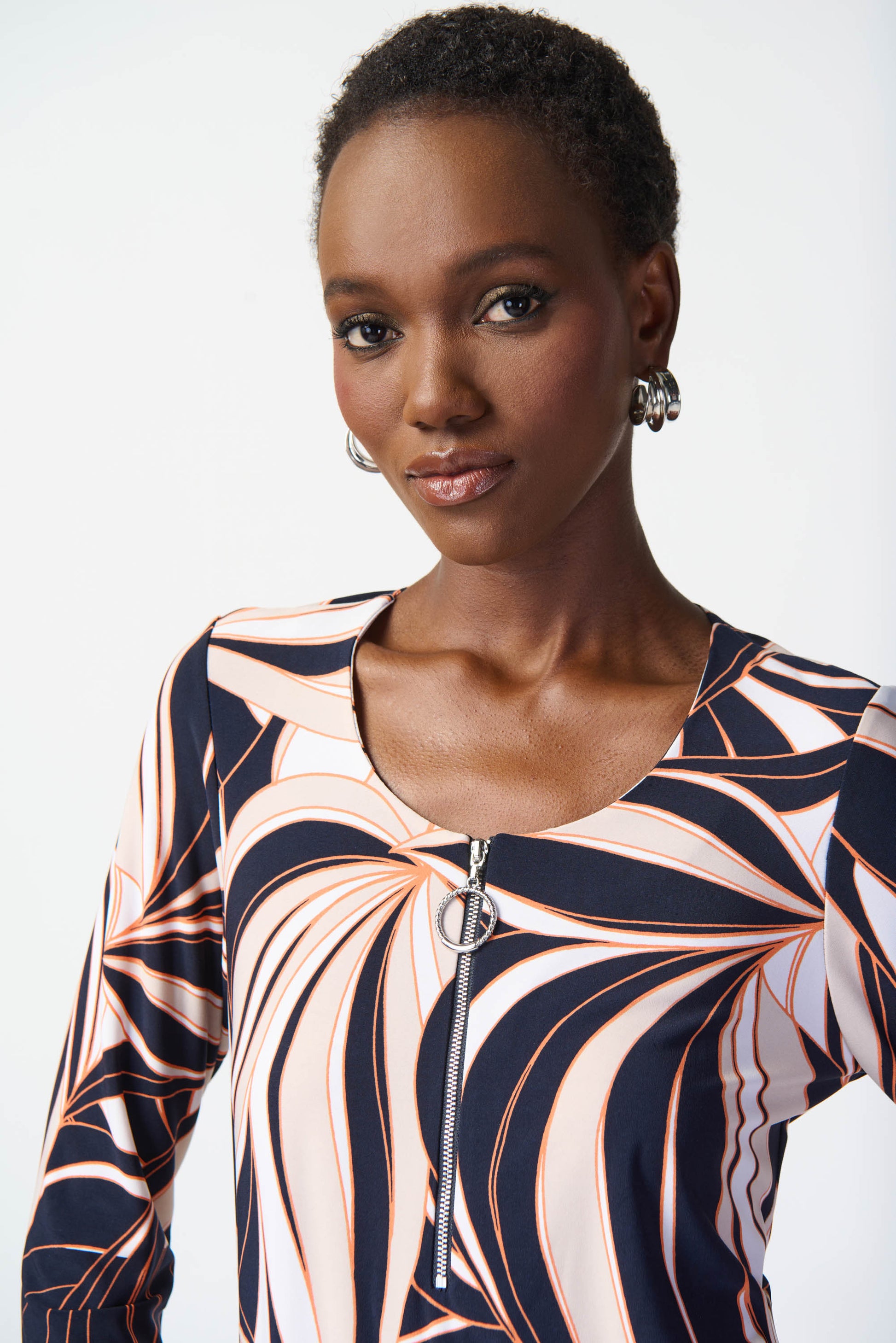This silky knit top’s refined look can easily transition from day to night. The piece features an alluring tropical print and a sleek zipped neckline for added elegance. The high-low hem paired with the three-quarter bell sleeves create an airy feel and elevate the garment’s straight silhouette.