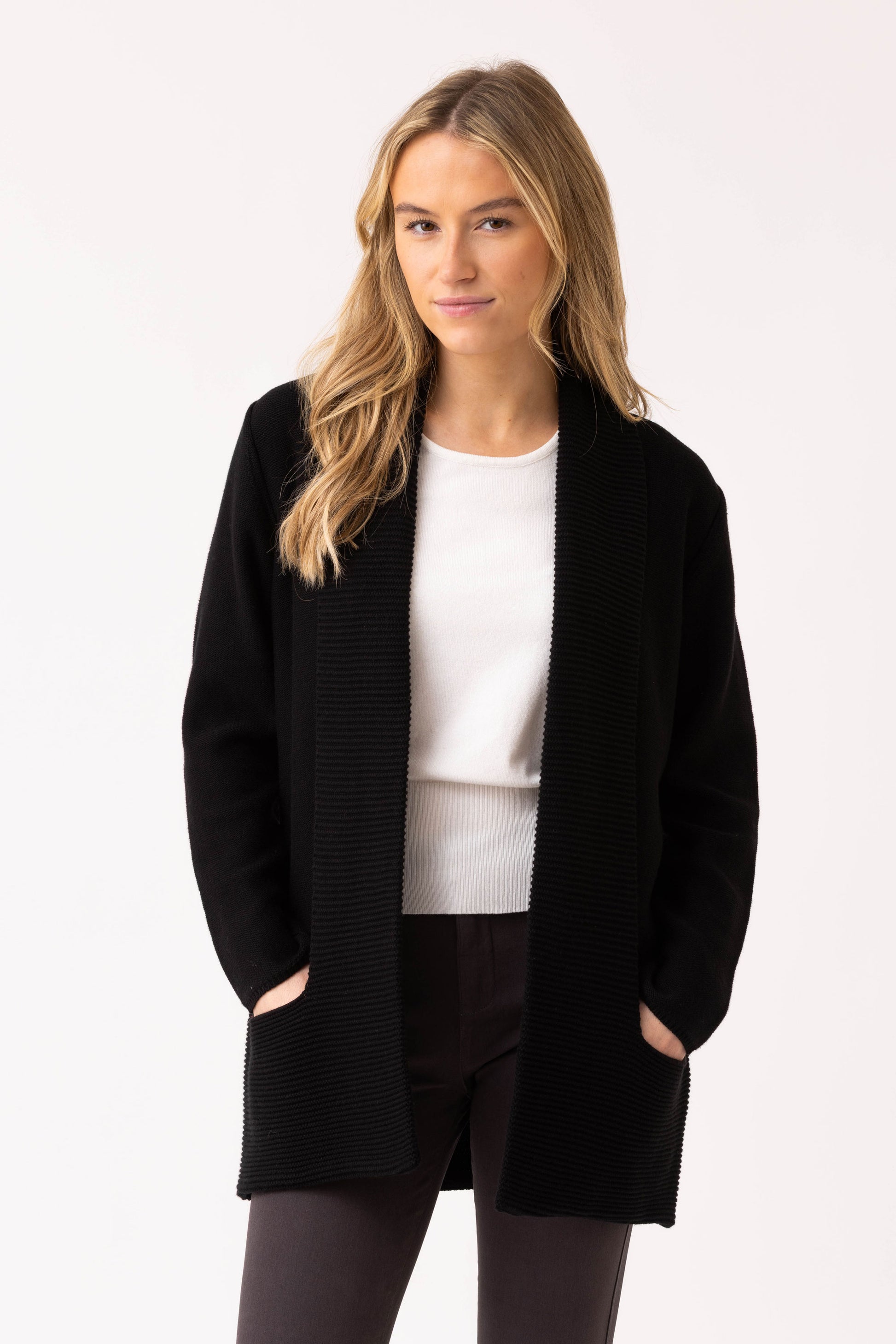 This versatile cardigan features stylish ribbed edging, adding texture and a polished finish. It has two generously-sized pockets for both practicality and a casual touch. The long sleeves ensure warmth and comfort, making it an ideal layering piece for any season.