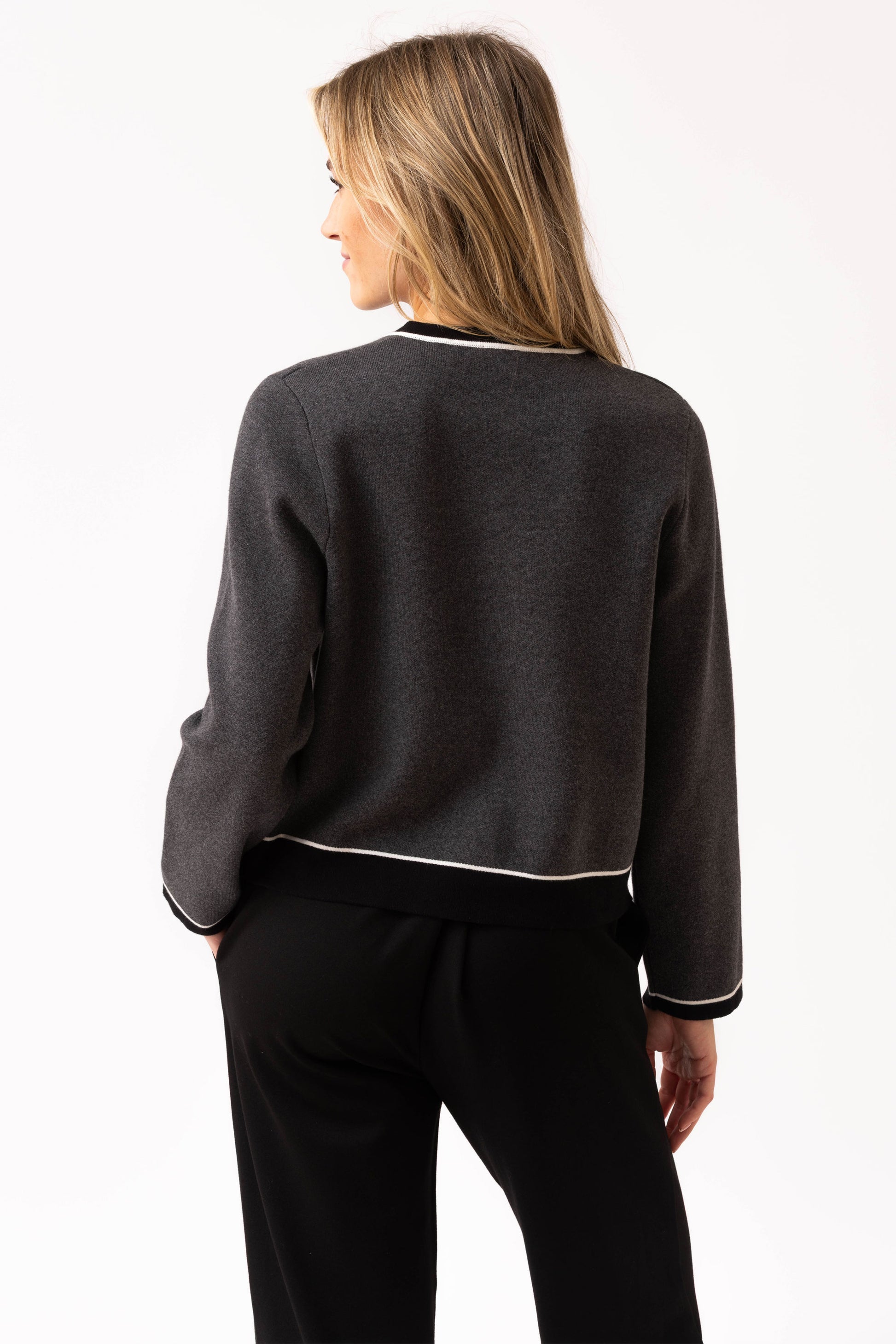 Add a pop of contrast to your wardrobe with this stylish two-tone cardigan. Featuring long sleeves, a classic round neckline, and a button-up front, it blends timeless design with a modern twist for easy layering and everyday wear.
