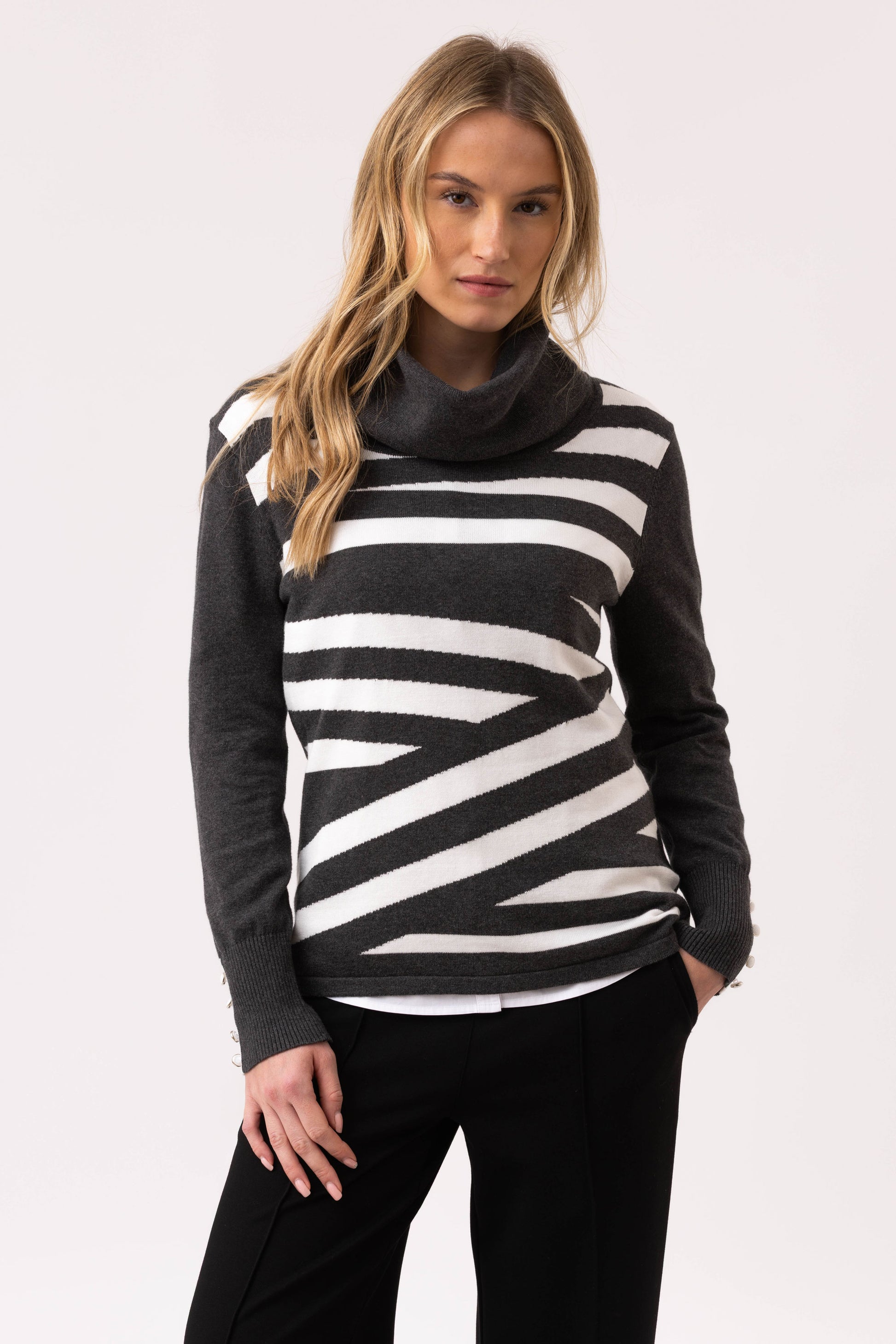 Cosy meets chic in this roll neck sweater, featuring a unique stripe cross-over pattern that adds texture and visual interest. Designed with long sleeves and finished with a sophisticated four-button detail at the cuffs, this piece brings subtle elegance to your everyday style. The high neckline offers warmth and a refined silhouette, making it perfect for layering or wearing solo on cooler days.