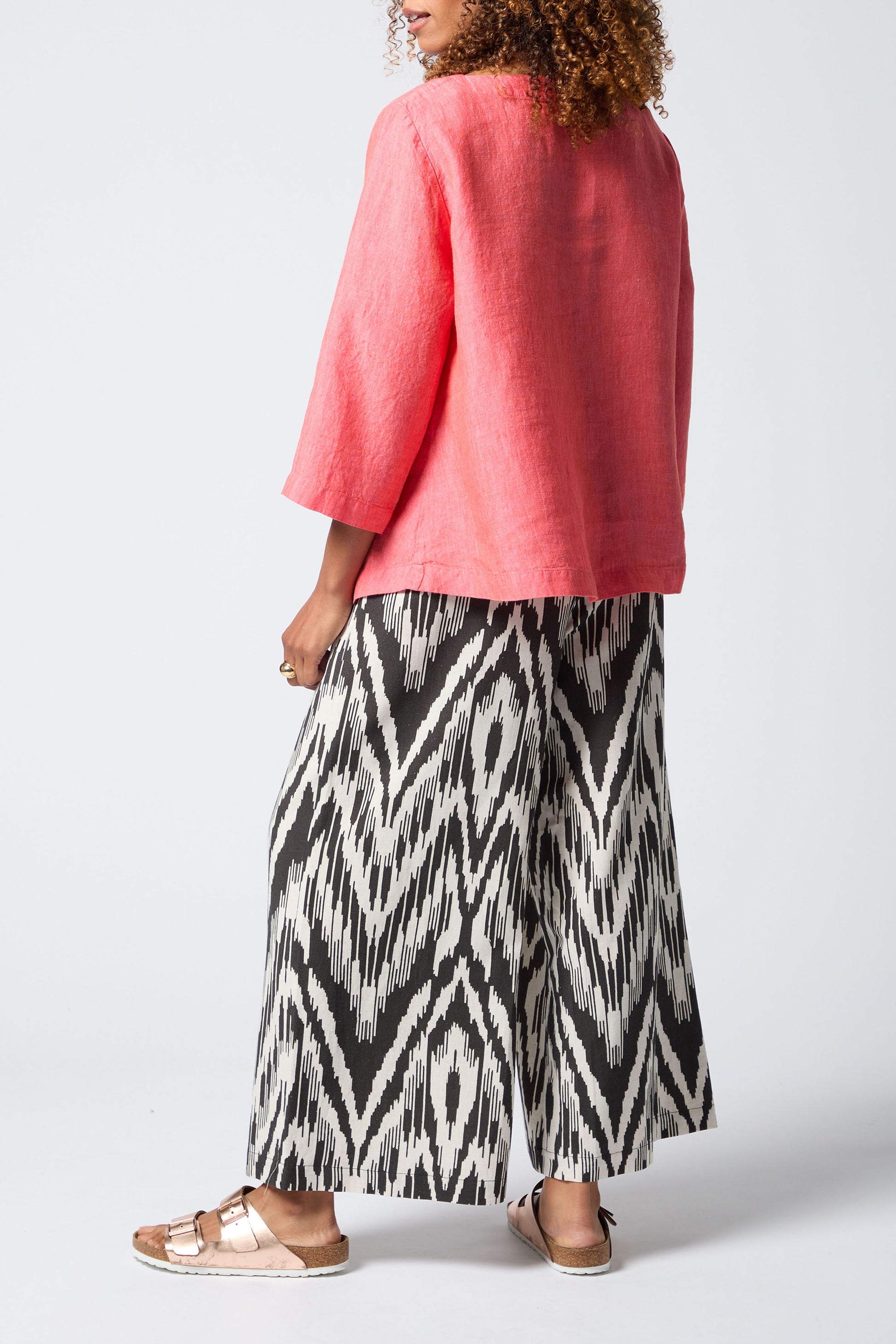 Discover effortless style with our Sahara New Season Monochrome Wide Leg Ikat Trousers in classic black and white. Perfect for any occasion, these trendy trousers are available both in-store and online. Elevate your ensemble by pairing them with our matching Ikat Tunic for a coordinated and chic look. Embrace the contemporary flair of the monochrome trend and make a statement wherever you go.