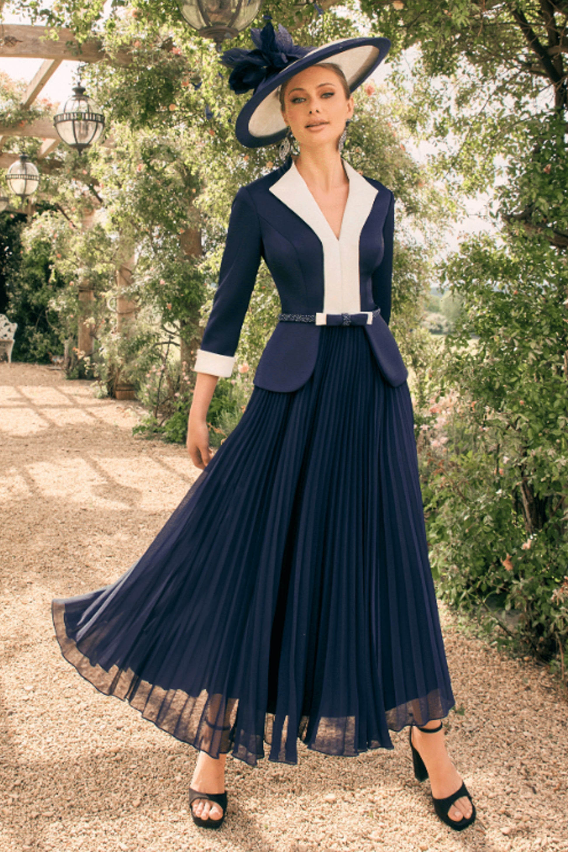 Sophisticated and timeless, the Veni Infantino Chiffon & Beaded Trim Dress in Navy/Ivory combines elegance with effortless style. Designed to give the illusion of a jacket and dress, it features a structured navy bodice with ivory trim and a sparkling beaded waistband for subtle glamour. The soft pleated chiffon skirt adds graceful movement, making this the perfect outfit for the Mother of the Bride or Groom, or any special occasion guest.