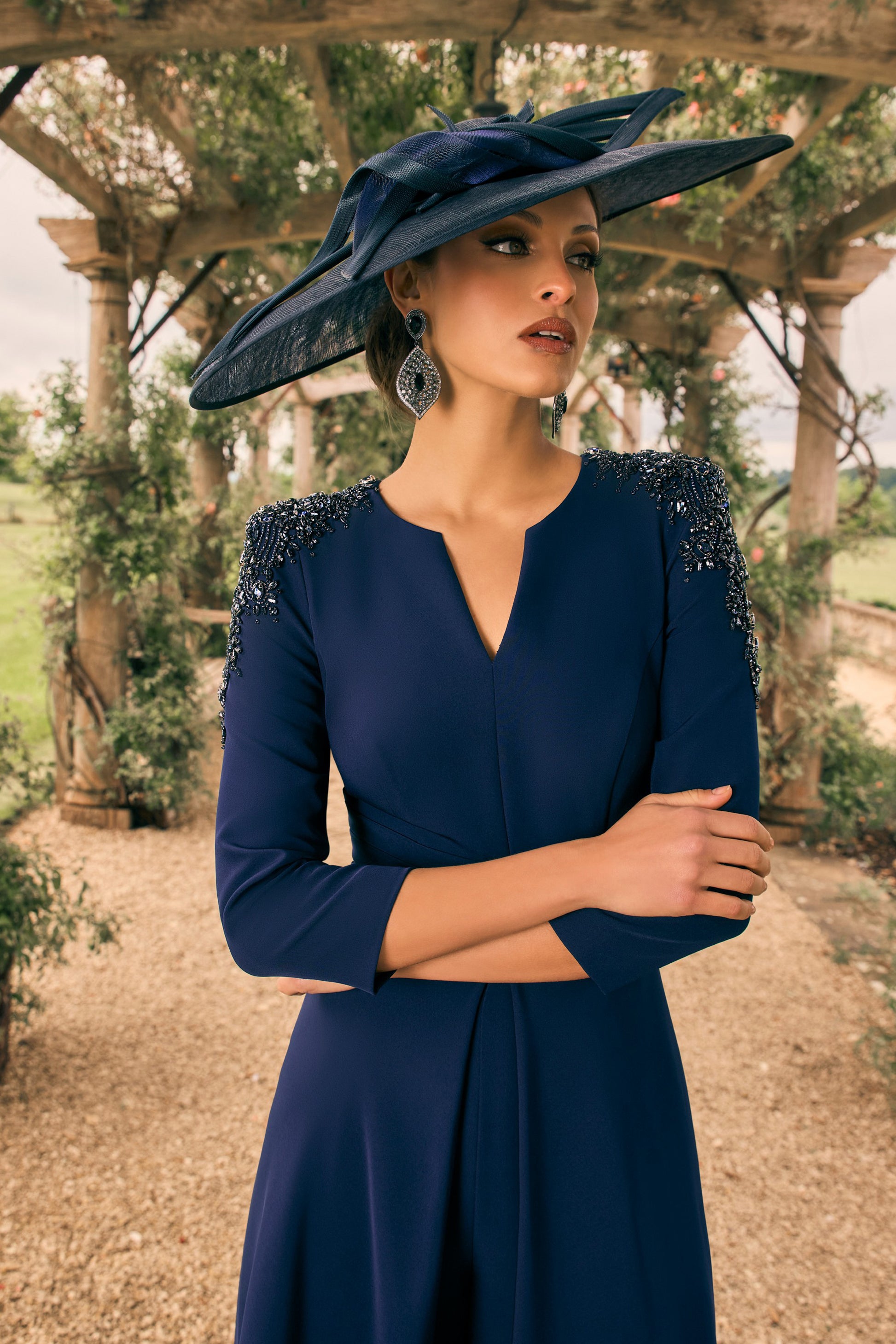 Step into timeless elegance with the Veni Infantino Crepe & Bead Trim Jumpsuit in Navy. Featuring a chic round neckline with a cut-out V detail, delicate bead trim on the shoulders, and flattering wide-leg trousers, this sophisticated jumpsuit is perfect for the Mother of the Bride or Groom, or any special occasion guest. Crafted in luxurious crepe for a sleek silhouette, it’s a modern alternative to traditional occasionwear.