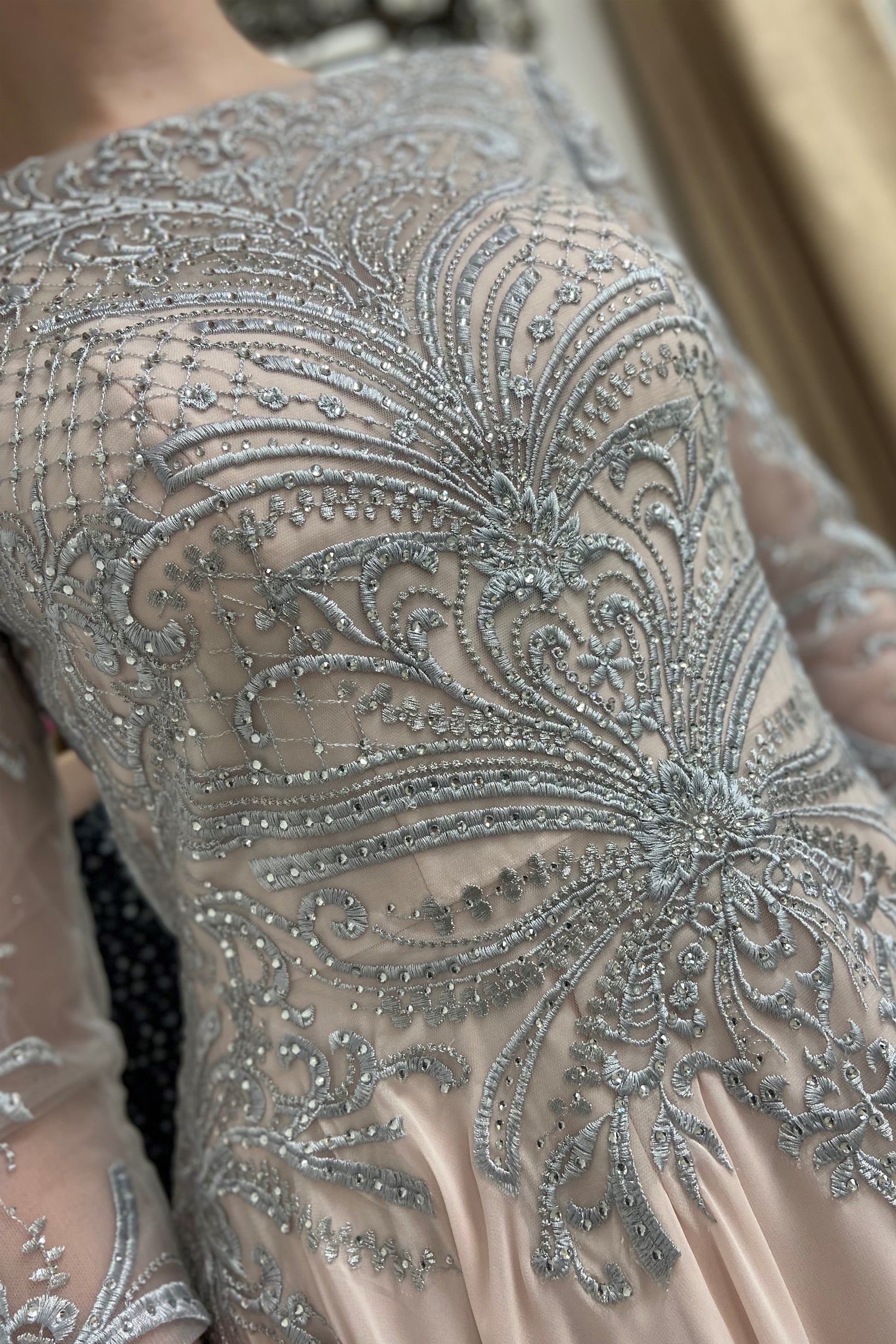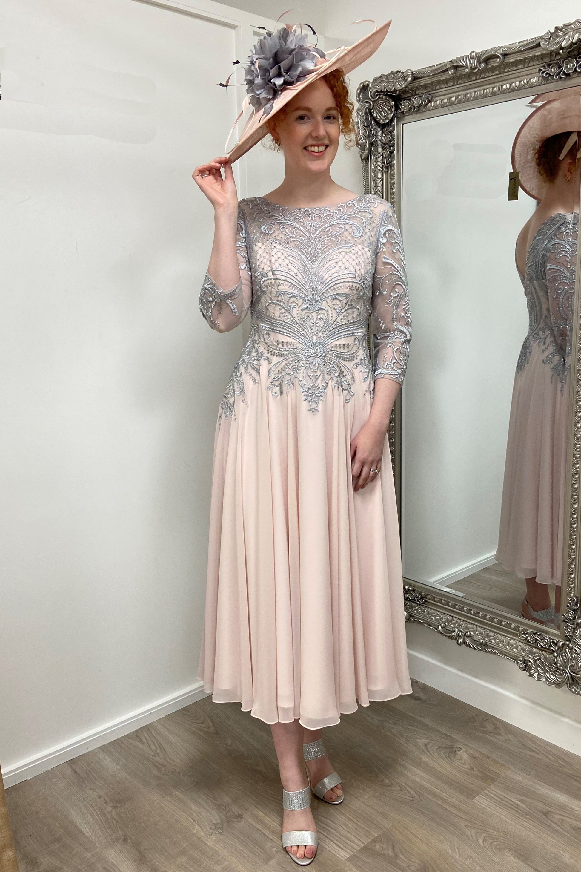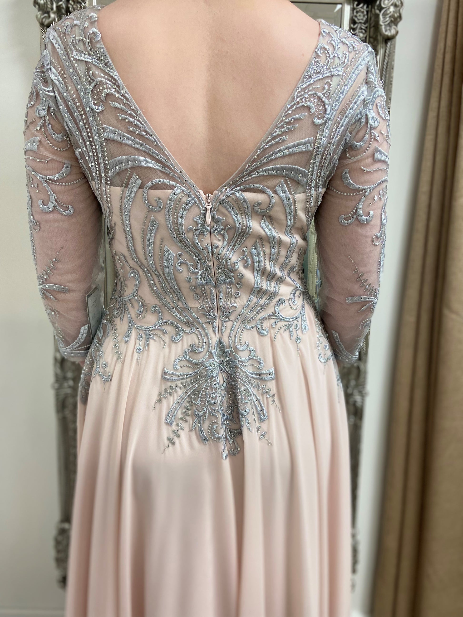 Discover elegance in the Veni Infantino Sheer Lace Bodice Dress in Silver/Ice Pink (992155A). This exquisite dress features a graceful A-Line silhouette with a bateau neckline and stunning illusion details. Adorned with intricate lace appliques, delicate beading, and sheer lace sleeves, this dress is the epitome of timeless charm. Crafted from luxurious chiffon, it exudes a sense of sophistication. Elevate your style with this enchanting dress, perfect for Mother of the Bride/Groom.